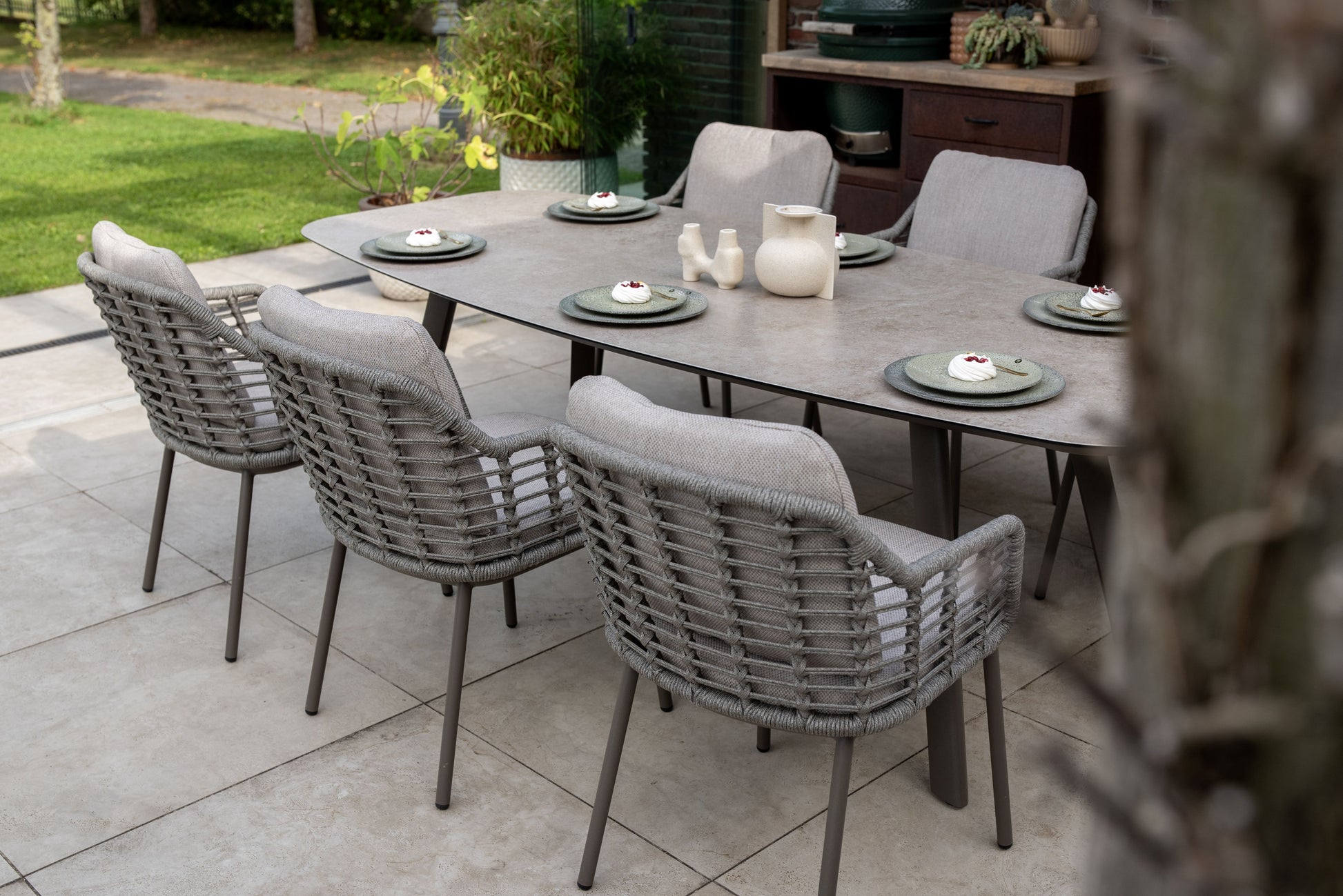 Sete og rygg er utført i håndflettet rope med en sterk syntetisk kjerne og slitesterk ytterfiber. Materialet er utviklet for å tåle daglig bruk utendørs og har høy formstabilitet, slik at det ikke strekker seg eller mister spenst over tid. Rope gir samtidig god komfort og et luftig designuttrykk.