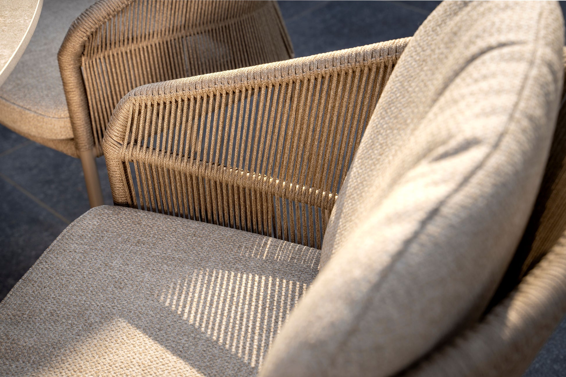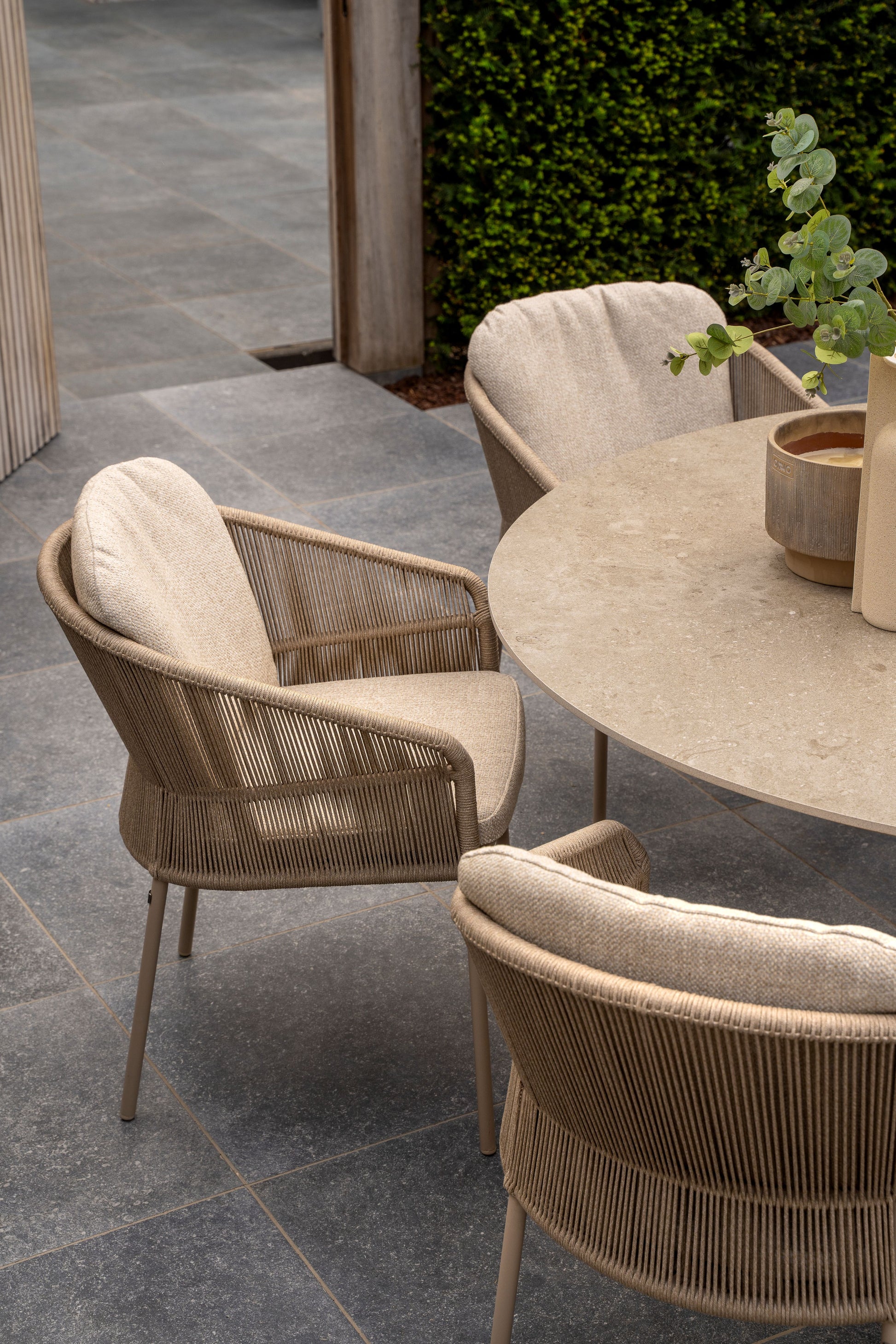Kombinasjonen av rope, aluminium og keramikk gir en harmonisk balanse mellom komfort, funksjonalitet og moderne design. Spisegruppen passer like godt til terrasse som til hage og skaper en innbydende ramme rundt måltider og sosiale sammenkomster.